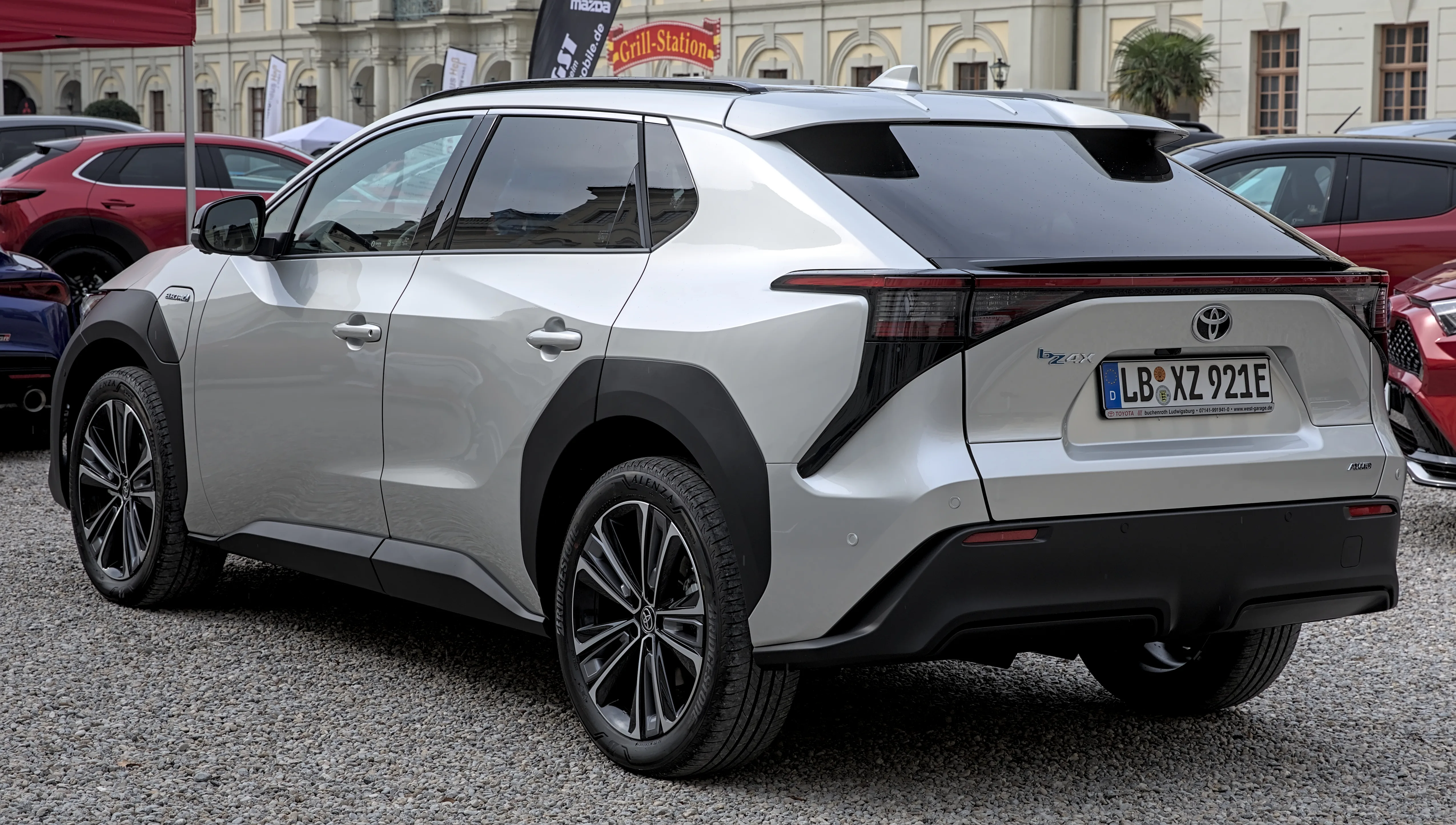 Toyota bZ4X to **PIERWSZE PEŁNE EV TOYOTY** na rynku (2022) — joint venture Toyota-Subaru, więc Subaru Solterra to praktycznie ten sam samochód (różnica w logo, drobne detale). Body: SUV crossover średni segment C-EV (rywal Tesla Model Y, VW ID.4, Hyundai Ioniq 5). Platforma e-TNGA (Toyota EV-only, dedicated). Wersje: **Single Motor FWD (204 KM, 71.4 kWh, ~516 km WLTP)**, **Dual Motor AWD (218 KM, 71.4 kWh, ~470 km — niższy zasięg AWD)**, **FL 2024+ AWD (343 KM joint Subaru — sport pakiet)**. DC ładowanie: 150 kW pre-FL i FL — średnie (vs Tesla Model Y 250 kW, Ioniq 5 230 kW, Polestar 2 250 kW). X-MODE off-road mode (Subaru Solterra-share). Cena PL: **180-260k PLN**. KRYTYCZNA WADA: **recall battery 2022 — globalny stop produkcji + odsprzedaż klientom! Toyota wykryła luźne bolts mocowania koła** (śruby koła mogły się wysunąć przy intensywnej jeździe). Toyota nakazała stop produkcji i odsprzedaż aut z bonusem (rzadki przypadek w historii recall). Klient świadomy 180-260k PLN — pre-purchase oględziny dla tej kwoty są OBOWIĄZKOWE. Forum klubowe: **toyota-club.pl** + bz4xforum.com. Specyficzne pułapki bZ4X: recall bolts kół 2022 (sprawdź VIN!), e-TNGA pierwsza Toyota dedicated EV (wczesne 2022-2023 software bugs), DC charging tylko 150 kW (wolne), HVAC heat pump standard (plus), AWD low range (gorsza efektywność niż FWD), Subaru Solterra sibling (wspólna produkcja Japan), MMB infotainment basic Toyota, sterownik elektroniczny wczesne 2022-2023, klamki TRADYCYJNE (NIE flush — Toyota wybrała klasykę!), brake regen średnie (single-pedal niezbyt mocne vs Tesla), klimatyzacja electric, Toyota Safety Sense 3.0 standard (radary + kamera).